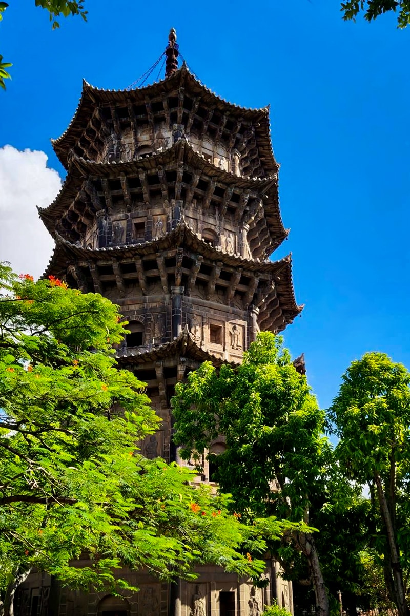 福建|泉州中國, 泉州 泉州,一個遍地閩南古跡的城市 走在步行街白色鐘樓與紅色磚瓦,形成鮮明對比,仿佛帶我們穿越了百年的時空。 來到開元寺,不得不被南宋時期的東西兩座古塔吸引。 卯榫結構的古塔,無論從哪個角度仰望,都層層遞進、立體感十足。 砂礫色的塔身,經歷歲月風雨的洗刷後,呈現出別往的光澤:有的青灰調,低語著滄桑與感傷;有的橙紅,感嘆著榮耀與堅韌。 在古塔下戴上一支橘黃色的簪花,默默許下浪漫的期望。 對街的林松喜餐廳,則以一座南洋小樓迎客。 沙茶鍋、薑母鴨,伴隨著焦糖色的煸炒香氣,讓人食指大動,沒有人能抗拒這一味。 不遠處,梧林村,是一座南洋文化小村,則展現另一種風貌。 走在紅磚碉樓的長廊間,磚紅色的牆面、秋黃色的雕花、湖水藍的瓷磚、土灰色的地板與琉璃綠的欄杆,看似對比,卻又將冷暖色調融合得很好。 巴洛克與閩南建築的融合,更寄託著海外華僑的思鄉之情,也在家鄉守護著萬家萬戶,一份守望與歸屬。 夕陽下,若走進藏海厝啜飲一杯財神拿鐵,換上娘惹服飾,頭戴花釵,在古村的氛圍裡細細品味,慢慢體驗一次泉州的美好吧。